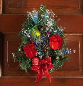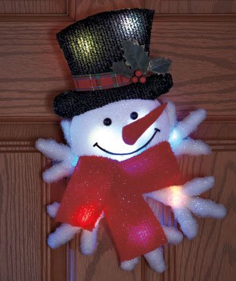 Here are front door decorations that light up. Hang one of these on your front door to bring the holiday theme to your front porch.